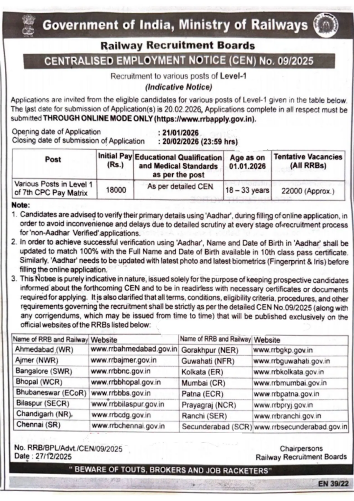 The Railway Recruitment Boards (RRBs) published a short RRB Group D 2026 Notification (CEN 09/2025) on December 23 2025 in the Employment Newspaper, announcing the registration dates and total vacancies. A detailed notification for the 22,000 Level 1 vacancies, including Pointsman, Assistant, Track Maintainer, Assistant Loco Shed, and Group D posts, will be released on the official website soon, providing complete information about CEN/RRC-01/2019.
